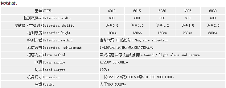 說明:檢針機靈敏度的高低由檢測高度(即通道或龍門)來決定最高檢測精度。龍門越高,靈敏度就相應(yīng)降低。以上對應(yīng)的高度和檢測標(biāo)準(zhǔn)是在空機狀態(tài)下的檢測結(jié)果;檢測通道高度和寬度,都可以按要求定做!