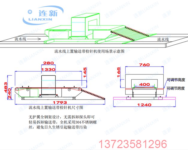 這是一款專門為流水線生產(chǎn)設(shè)計(jì)制作的輸送帶式檢針機(jī),可直接放置在流水線上使用進(jìn)行檢針驗(yàn)針作業(yè),不需要改造流水線就可以加裝檢針機(jī),也不需要占用通道擺放檢針機(jī),節(jié)省使用空間節(jié)省檢針時(shí)間和效率。