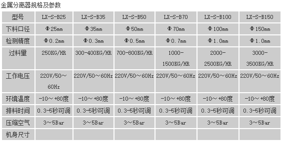 原料從料斗或送料器自由下落進(jìn)入金屬分離器,如果沒有金屬雜質(zhì),原料會(huì)直接通過金屬分離器流向下端的出料口。如果檢測(cè)器檢測(cè)到原料中含有金屬,那么控制器立刻啟動(dòng)分離板將金屬物和部分原料一起導(dǎo)向側(cè)面的排料口,然后分流板迅速恢復(fù)至正常的位置,分流板速度可調(diào),金屬分離器的檢測(cè)精度也可根據(jù)生產(chǎn)需要調(diào)節(jié),最小可檢測(cè)并分離出Φ 0.2mm的金屬顆粒。